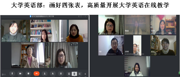 大学英语部承担着全校2018级、2019级6000多名学生的大学英语教学。根据学校新冠肺炎疫情防控工作要求,结合教务处本科教学安排,从2月初开始积极筹备大学英语在线教学,努力画好“四张表”,做好四个方面工作:一是抓协调组织,画好责任分工表,成立教学副院长、大外部主任、副主任、课程组长为成员的在线教学筹备工作小组,多次召开视频研讨,确保学校决策部署第一时间学习传达,并按照“线下学习,线上互动,平台展示”教学理念,合理制定网上教学实施方案和管理方案;二是抓学生排摸,画好班级选课表,利用微信、QQ、钉钉等新媒体工具,建立学生选课情况名单信息库,任课教师向每位学生调查了解在线教学需求和学习保障需求,对在线教学困难学生给予指导帮助;三是抓课程质量,画好教学模块表,大学英语课程分3个层次,4个模块课程教学,各课程组分头召开视频会议,进行网上教学研讨,统一规划学习内容,设计开发网上学习资源,保证学习资源质量。四是抓模拟演练,画好平台操作表,各课程组提前一周分头组织师生利用钉钉、QQ直播等平台开展网上教学测试工作,编印师生在线学习注意事项小指南,明确大学英语在线教学精准安排,不断提高师生在线教学的主动性和自觉性,确保高质量开展大学英语在线教学。