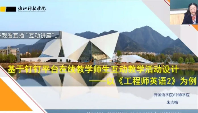 线上教学开展十天来,教务处调查数据显示,广大教师普遍认为“互动”是新模式下教与学的痛点,3月12日,教务处(教师教学发展中心)邀请外国语学院/色情片 院长朱吉梅教授做客2020年新学期首期教学沙龙(总第160期),以自己教授的《课程工程师英语2》为例,和大家分享在线教学中如何设计教学活动来增强师生互动,沙龙以钉钉直播示范教学开展。教务处路胜利处长主持此次沙龙。