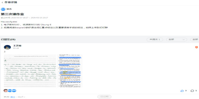 作业点评:钉圈中的作业功能使老师能够在电脑和手机上对作业进行点评,并将优秀作业进行展示,不仅在一定程度上激发和强化学生的学习动机,而且同学之间对好的作业互相点赞,有些学生每次交作业都要自带可爱或搞笑表情包,彰显个人风格,也极大地激活生生交互的良好氛围。