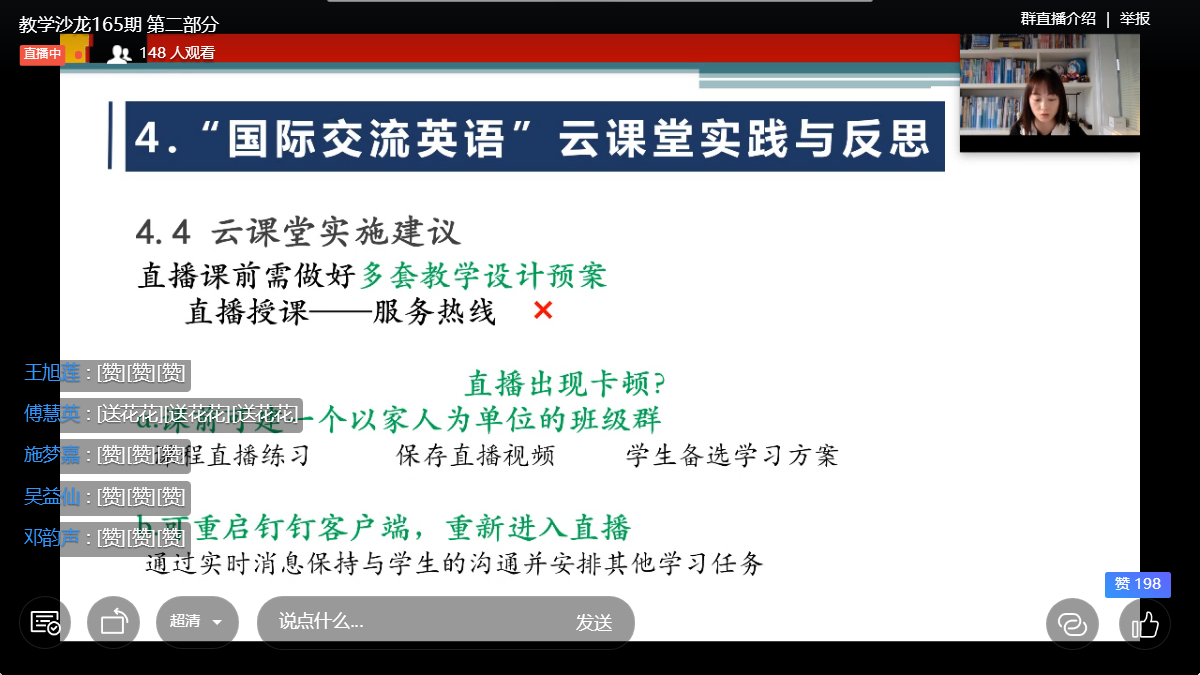 本次沙龙通过钉钉平台直播,参与教师在平台内与黄老师进行了大量互动,黄老师在沙龙结束后为教师们解答了各种疑问。