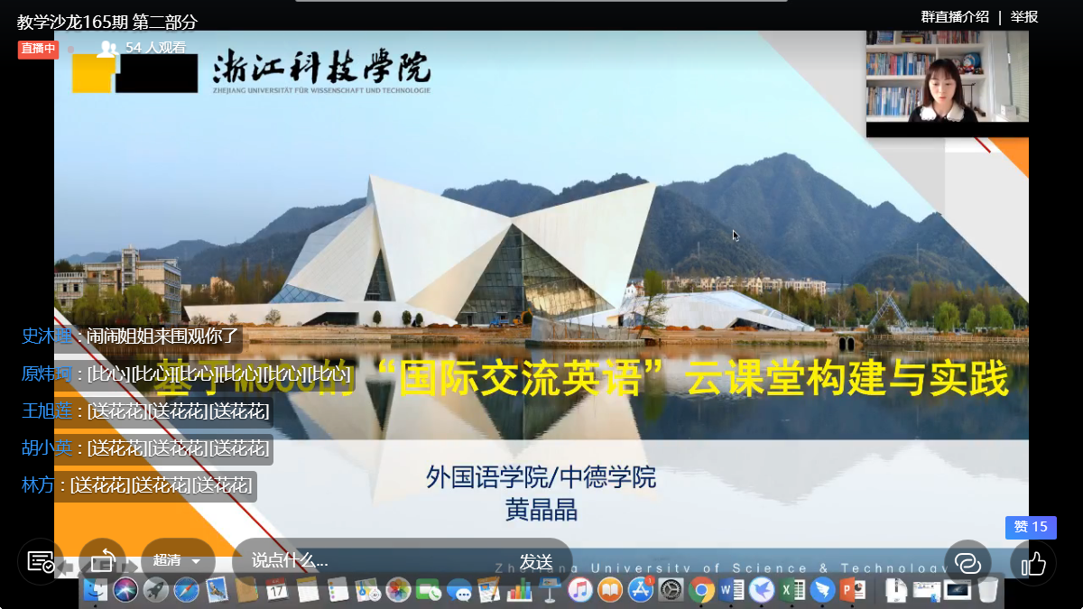 黄晶晶老师先从新冠肺炎疫情以来教育部发文要求各级学校开展在线教学、做到“停课不停学”开始,指出大学英语课程能否较好地开展线上教学活动对高校全面开展在线教学具有至关重要的影响,并对自己所承担的“国际交流英语”课程从课程定位、前期建设基础进行了简单介绍。黄老师重点分享了国际交流英语课程的云课堂构建情况,从教学内容、教学模式、程评价体系三个方面,配合平面界面及各种图表进行了详尽的介绍。
