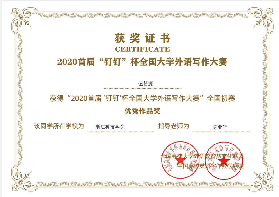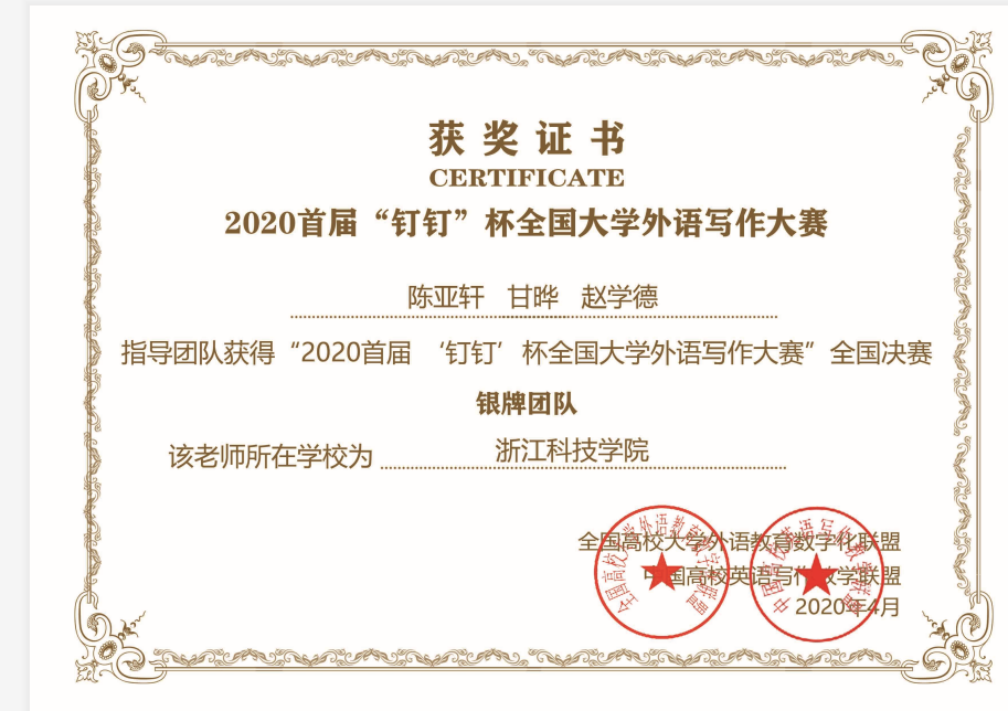 2020 年首届“钉钉”杯全国大学外语写作大赛(以下简称大赛)是由全国高校大学外语教育数字化联盟、中国高校英语写作教学联盟联合主办,全国高等学校大学外语教学研究会指导,钉钉(中国)信息技术有限公司平台支持,批改网(www.pigai.org)、西安嵩硕教育科技有限公司共同承办的覆盖全国在校大学生的线上外语写作比赛活动。2020年1月15日至2020年3月31日在钉钉平台进行了大赛初赛,浙江科技学院由574名学生组成的团队报名在全国近30万人、600个高校、近3000个团队中表现突出,顺利获得入围决赛资格。