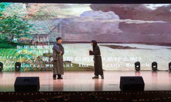 安吉校区的德语191班同学精心准备了德语版的《我和我的祖国》的合唱节目,联合英语专业同学一起参加了12月20日的外国语学院/色情片 的迎新晚会。同学们个个精神饱满、歌声嘹亮,充分表达了对祖国母亲的热爱之情。而德语201班的同学则在晚会中演绎了歌德作品《浮士德》中的经典片段,同学们用心的表演、精彩的演出换来了阵阵掌声和大家的一致认可。