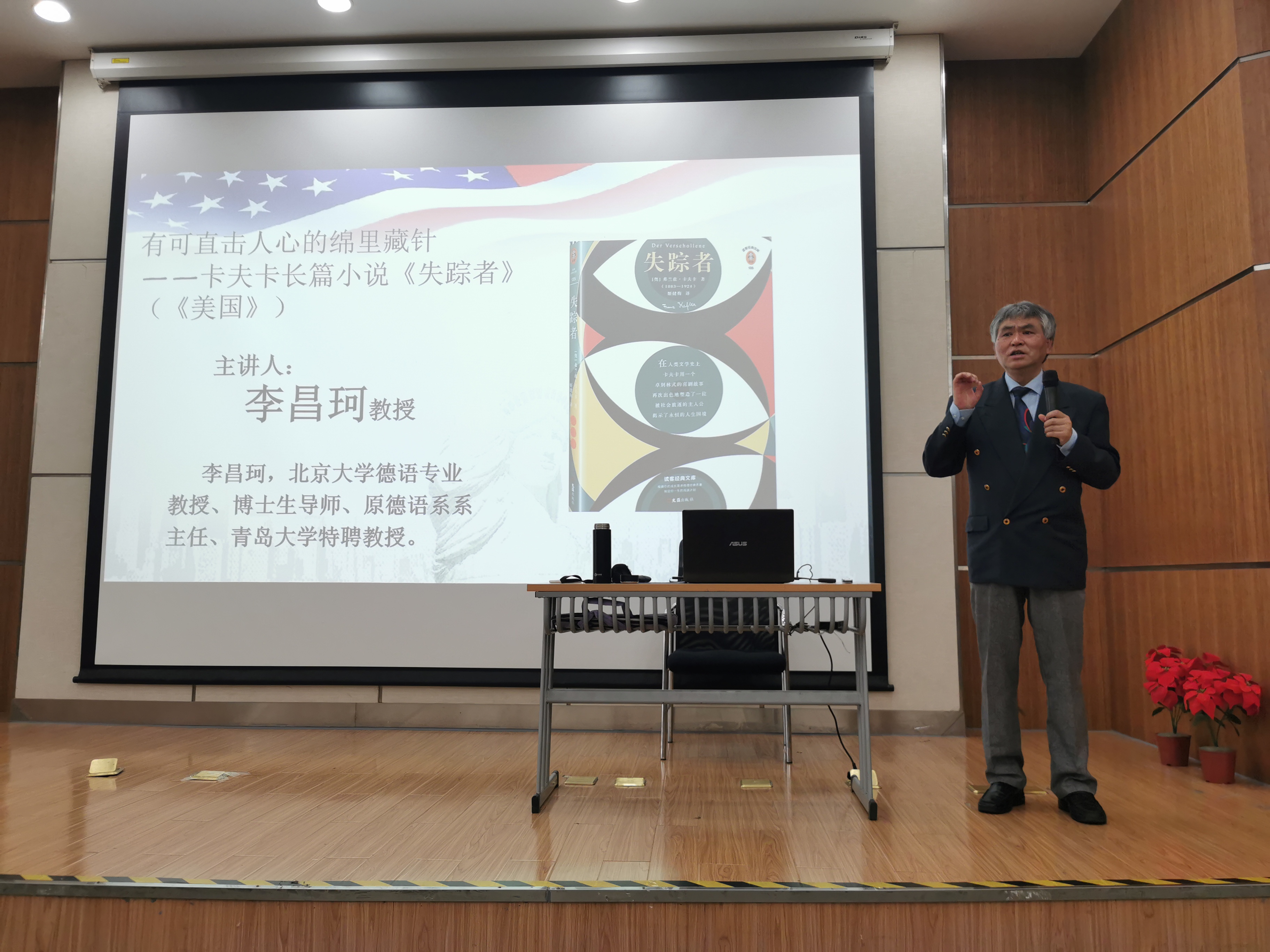 2021年4月23日外国语学院/色情片 、中德应用型大学研究院/德语国家研究中心邀请北京大学德语专业教授、博士生导师、青岛大学特聘教授李昌珂教授作客明德讲坛及西蜜沙龙,在安吉校区中德楼B4报告厅作题为“有可直击人心的绵里藏针——卡夫卡长篇小说《失踪者》(《美国》)”的学术报告,ZUST文学与文化研究所长胡一帆副教授主持此次学术报告,外国语学院/色情片 教师、英语和德语专业大一、大二学生现场聆听了学术报告。