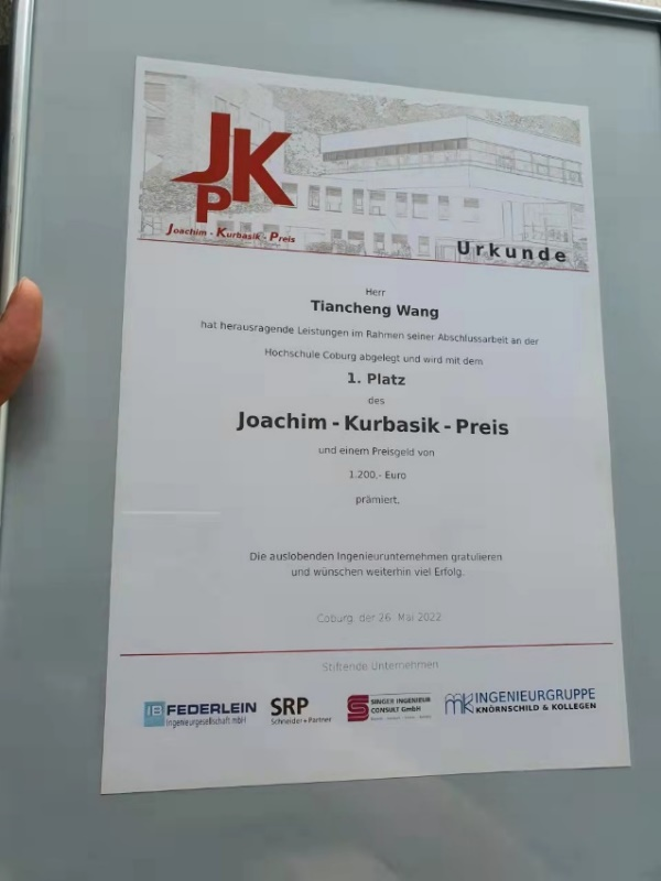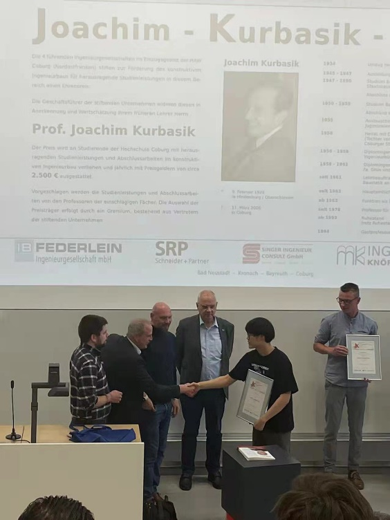 2022年5月26日,在德国科堡应用科技大学的JOACHIM-KURBASIK-PREIS奖学金评选中,色情片 2+3土木专业16级学生王天成获得了一等奖学金。这也是这个奖项自2014年创办以来首次颁发给外籍留学生。