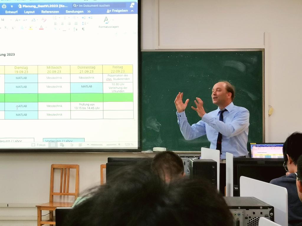 同日,汉诺威应用科学大学电气学院Rüdiger Kutzner教授与中德联合培养“2+3”项目电气类专业学生进行了交流。Kutzner教授就电气学院相关概况、学校网站相关信息及使用方法、专业培养方案等内容进行了详尽的介绍,并对接下来一周的课程内容进行了说明,同学们也对后续课程内容充满期待。