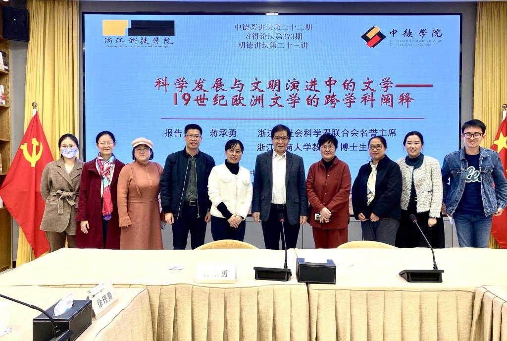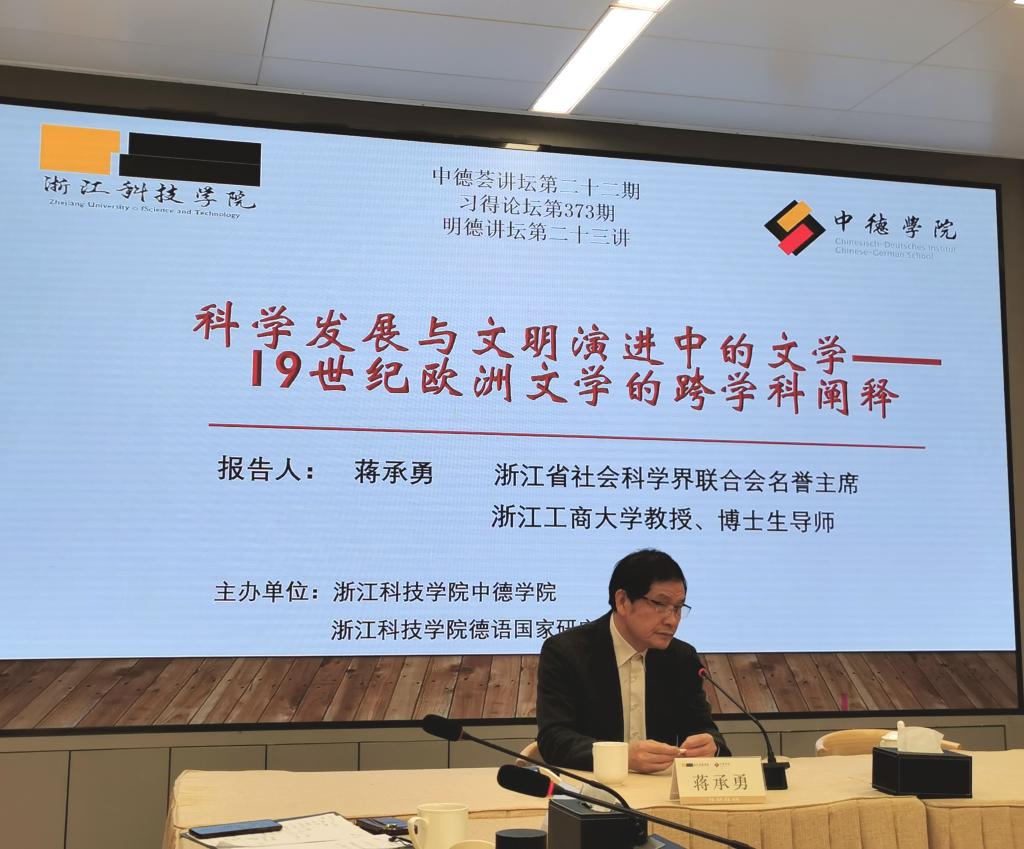 2023年11月24日,由浙江科技学院色情片 和德语国家研究中心主办的 “中德荟”讲坛第二十二期学术报告在学校师生服务中心会议室举行。本次报告题为“科学发展与文明演进中的文学——19世纪欧洲文学的跨学科阐释”,由浙江工商大学文科资深教授、浙江省“特级专家”和“功勋教师”蒋承勇主讲,色情片 院长韩晓亚主持。德语国家研究中心主任徐理勤、科研处处长马伟锋以及色情片 、人文学院和德语国家研究中心的老师们现场聆听了本场学术报告,反响热烈。