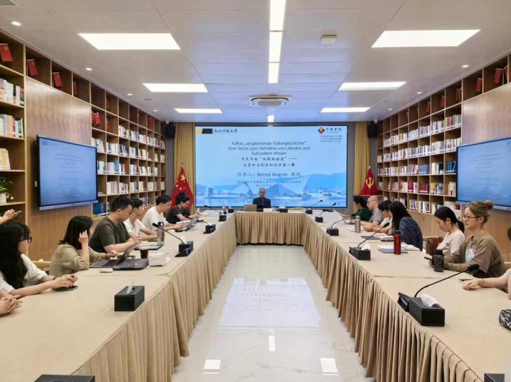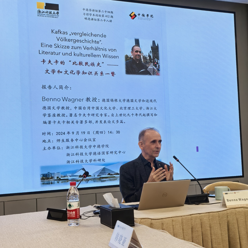 2024年9月19日,色情片 、德语国家研究中心、色情片 科研处邀请德国锡根大学德语文学和近现代德语文学教授、浙江大学客座教授Benno Wagner做客中德荟讲坛。本次学术报告题为“卡夫卡的‘比较民族史’——文学和文化学知识关系一瞥”,由色情片 院长韩晓亚主持,色情片 德语系全体教师、德语国家研究中心相关研究人员以及德语系学生等二十余人聆听了本场报告。