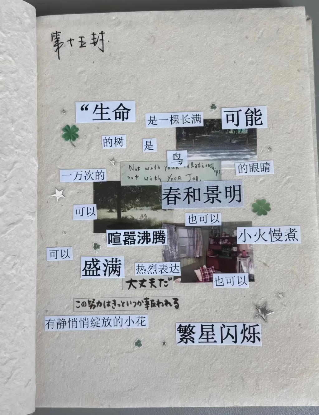 在最终的活动展示环节,一首首风格各异的拼贴诗映入眼帘。有的诗以明快的色彩勾勒出青春的活力与希望,字里行间洋溢着乐观向上;有的则在冷峻的词句拼接中,诉说着成长的烦恼与深沉思索;还有的用细腻的笔触,从平凡日常的字词里挖掘出温暖人心的力量。这些拼贴诗,不仅仅是文字的汇聚,更是同学们内心世界的生动映照,每一行诗都蕴含着他们对生活独特的解读、情感的沉淀以及灵魂深处的喃喃细语,见证了大家在拼贴诗创作中探索自我、感悟世界的珍贵历程。