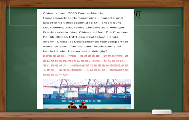 在教学内容的选择上,选择的都是当前比较热门的主题。比如习总书记在建党100周年上的讲话、2022年政府工作报告、20大金句以及德国总理访华等等。还有一些文化、历史的对比,比如中国的茶文化和德国的咖啡进行比较。这些主题学生会比较感兴趣,愿意去了解这方面的知识和信息。