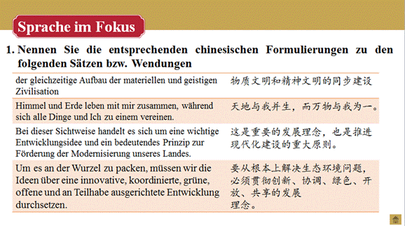 2.4 能用德语讲述中国共产党制定的生态环境保护政策、社会主义生态文明观、生态文明建设与建设美丽中国的关系及建设生态文明的全球意义;