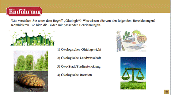 学生在阅读和讲解的过程中,内化文章内容与表达手段,能作口头报告; 掌握与生态文明建设相关的重要表达与固定搭配;能用德语介绍我国的生态环境保护政策、社会主义生态文明观、生态文明建设与建设美丽中国的关系及建设生态文明的全球意义。